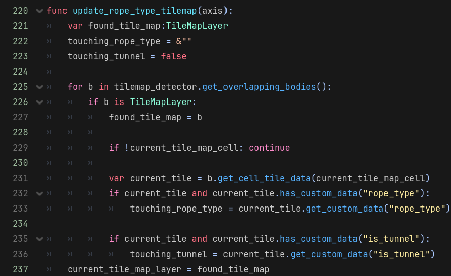 However, to detect if the player was touching a rope, I had to detect what tile in the tilemap they were touching. Rather than simply detecting if the player was touching or not touching a rope, I needed to know if the rope was horizontal, vertical, or a cross, and I needed to allow/restrict player movement accordingly. Recall that, when detecting collisions with a tile map layer, Godot only gives you the actual tile map object, not the tile you collided with. This makes sense from a programming perspective, since the tile isn't really an object in of itself. The TileMapLayer is just a mapping between positions and TileData objects, which are owned by the TileSet. So, if the physics engine returned TileData when the player collides with a TileMapLayer, you could actually lose information about where the collision was happening.