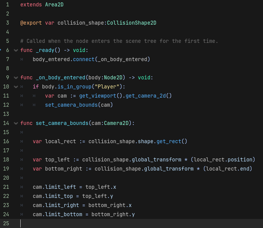 Of course, if you use this yourself, make sure the player is in the group "Player", or use another method of detecting that the body entering the area is in fact the player. Of everything in this game, the camera boundary script and the base player movement are probably the most reusable if I want to do something like this again.
