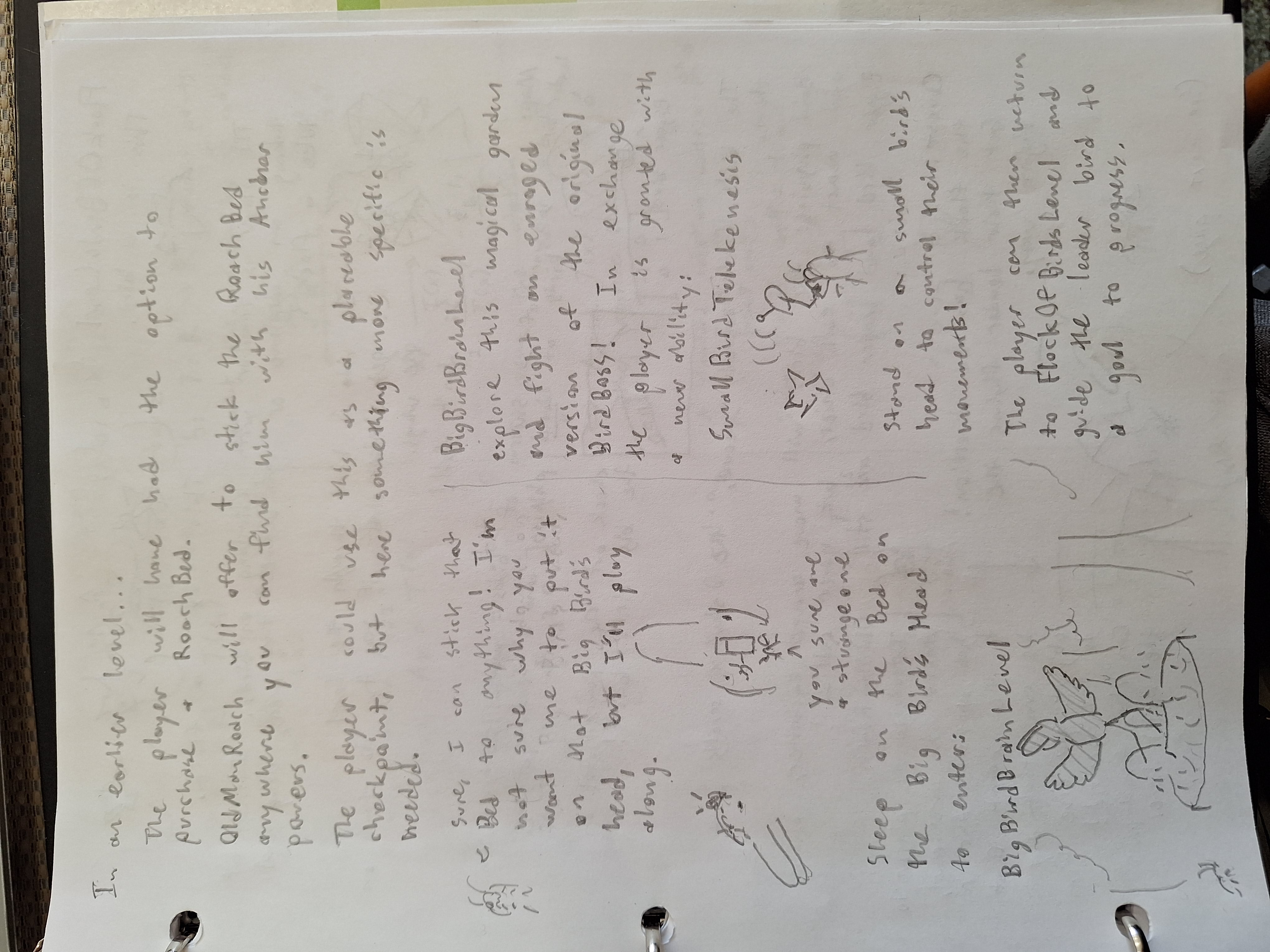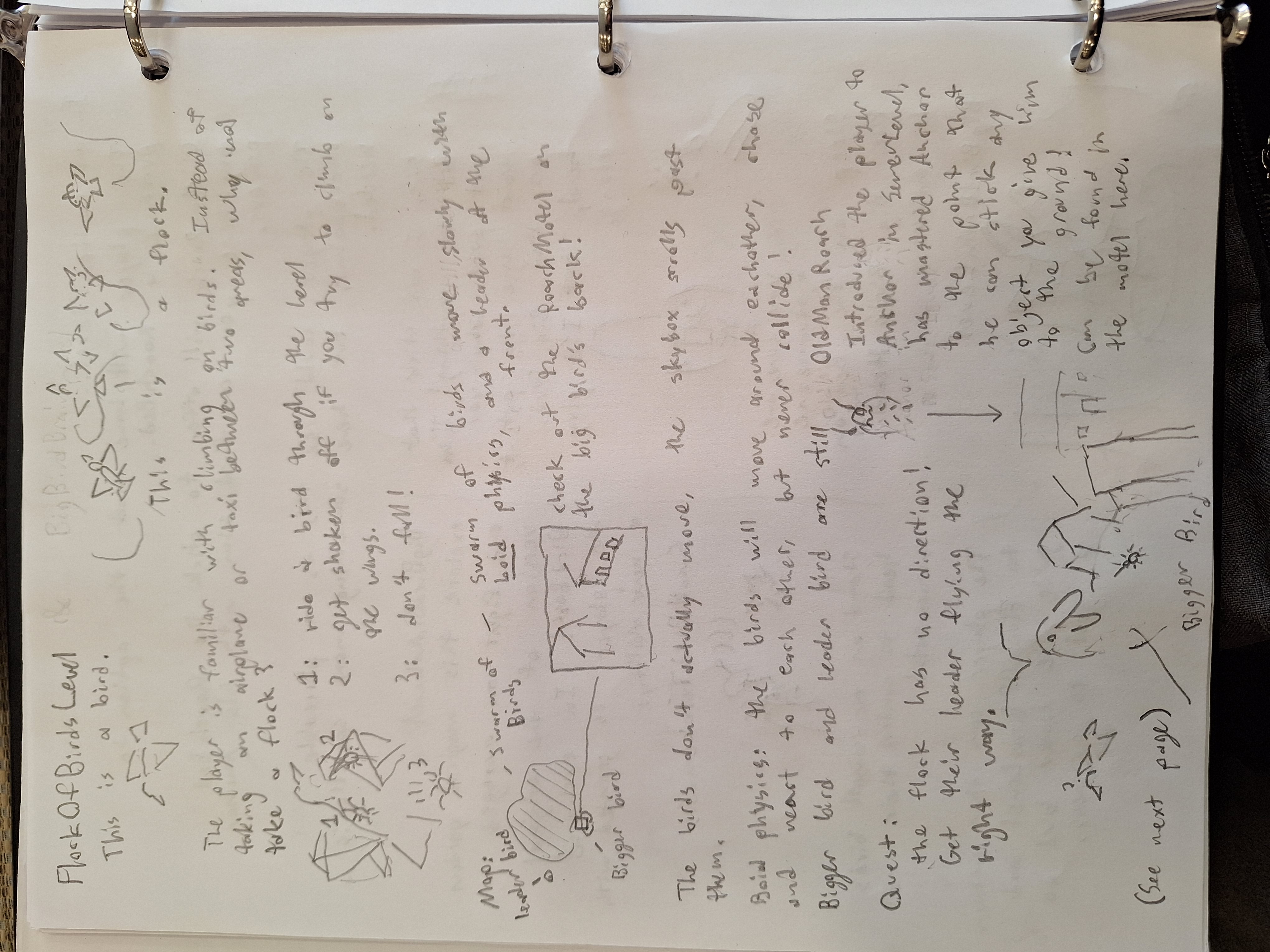 Even here, the notes a little vague and self-contradictory. At one point I say the flock is supposed to have boid physics and in another I say they're supposed to be static. The core progression is that you stick a bed to a bird's head to get into their dreams and steal the power to control birds. I've been told my games have a.. peculiar sensibility to them.